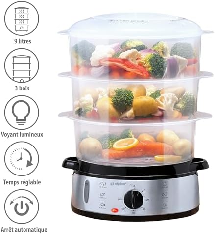 - Grande Capacité : Avec une capacité totale de 9 litres, vous pouvez cuire à la vapeur plusieurs plats simultanément.