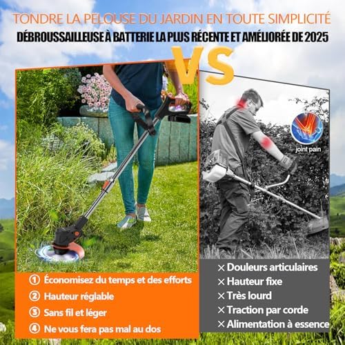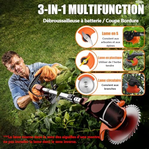 Cette débroussailleuse sans fil est parfaite pour mon jardin. Avec ses 3 lames, elle coupe facilement les herbes hautes. Elle est légère, donc pas de mal de dos après. Idéale pour un entretien régulier et rapide.