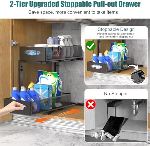 L'étagère sous évier coulissante à 2 niveaux transforme chaque espace sous évier en un havre d'organisation. Avec ses paniers coulissants en maille et sa hauteur ajustable, elle s'adapte à vos besoins tout en offrant une robustesse inégalée grâce à sa construction en fer antirouille et ses ventouses puissantes qui garantissent une stabilité sans faille.