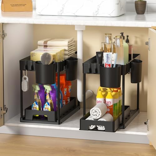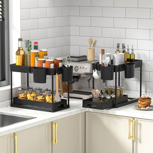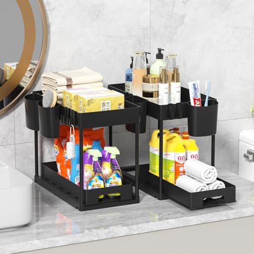 Organisateur sous évier à 2 étages avec tiroir coulissant, Noir, 39x21x32,5 cm
