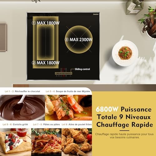 Plaque Induction 3 Feux Flexible 6800W, Verre Noir, Fonction Boost et Sécurité