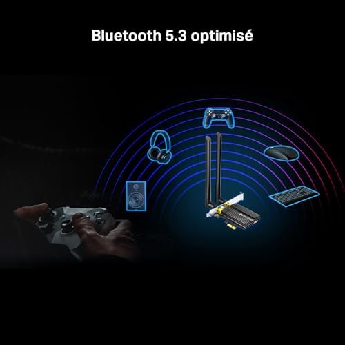 La carte WiFi 6 PCIe Archer TX55E de TP-Link offre une connexion rapide et stable, idéale pour diffuser des vidéos en streaming lors de vos soirées entre amis. Le Bluetooth 5.2 intégré permet de connecter facilement vos appareils. Les deux antennes assurent une couverture optimale, même dans les coins reculés de la maison.