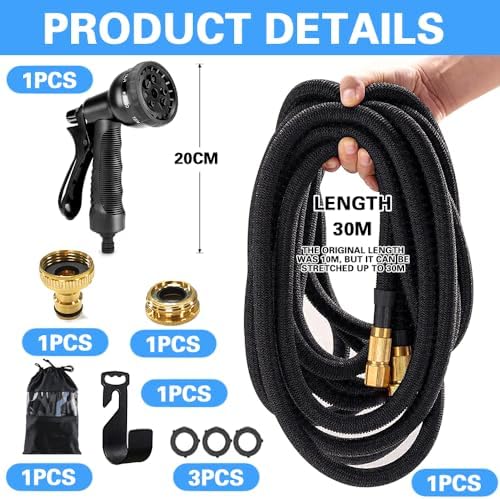 - Dimensions Précises : Le tuyau mesure initialement 10 mètres et s'étend jusqu'à 30 mètres pour une couverture maximale.