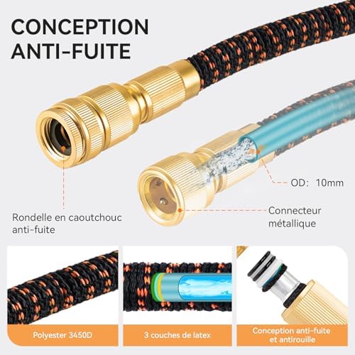Ce tuyau d'arrosage extensible est incroyablement performant. Les 10 modèles de pulvérisation permettent une précision optimale pour arroser mes plantes délicates. Le système ne fuit pas et s'étend sans effort à 30m, idéal pour mon grand jardin.